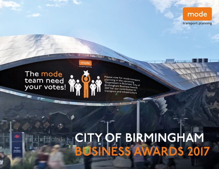 mode transport planning are proud to announce that we have been nominated for the “Contributions to Transport and Infrastructure” award in this years City of Birmimgham Business Awards 2017. The mode transport planning team would love you to support us by voting here!